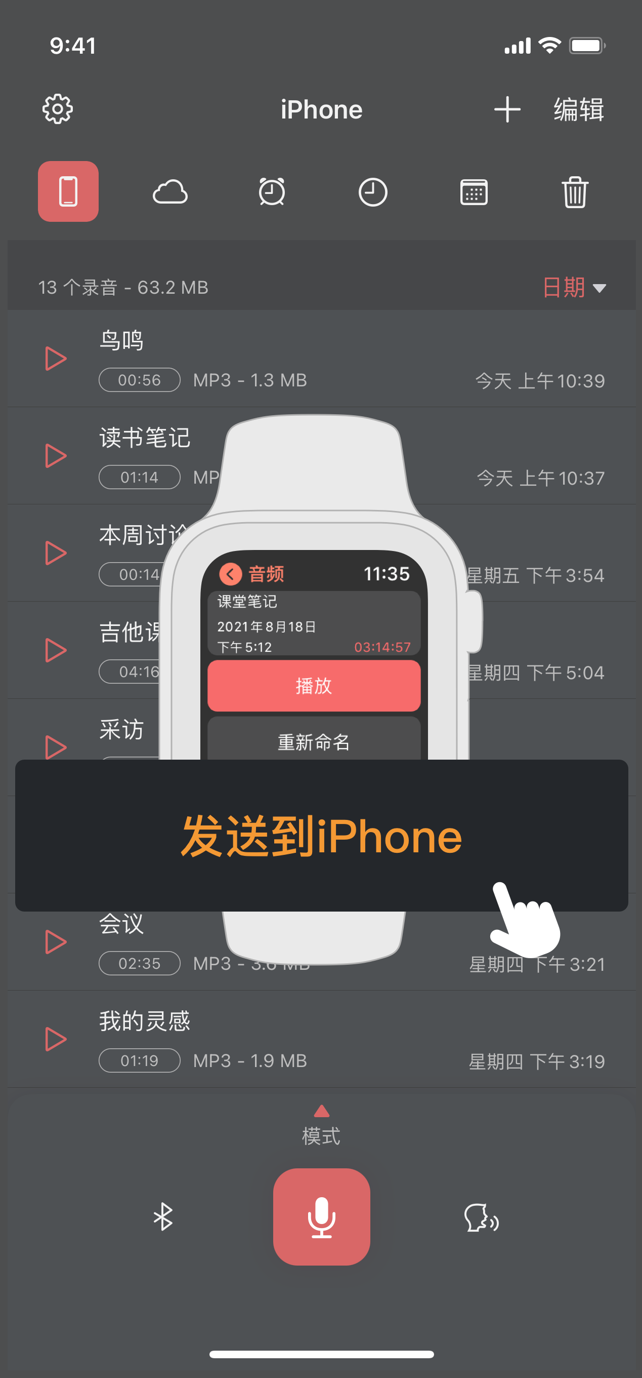 4、在 Apple Watch上打开录音专业版,点击录音文件,使用 发送到 iPhone 功能,把录音文件存储到 iPhone 进行编辑和备份。
