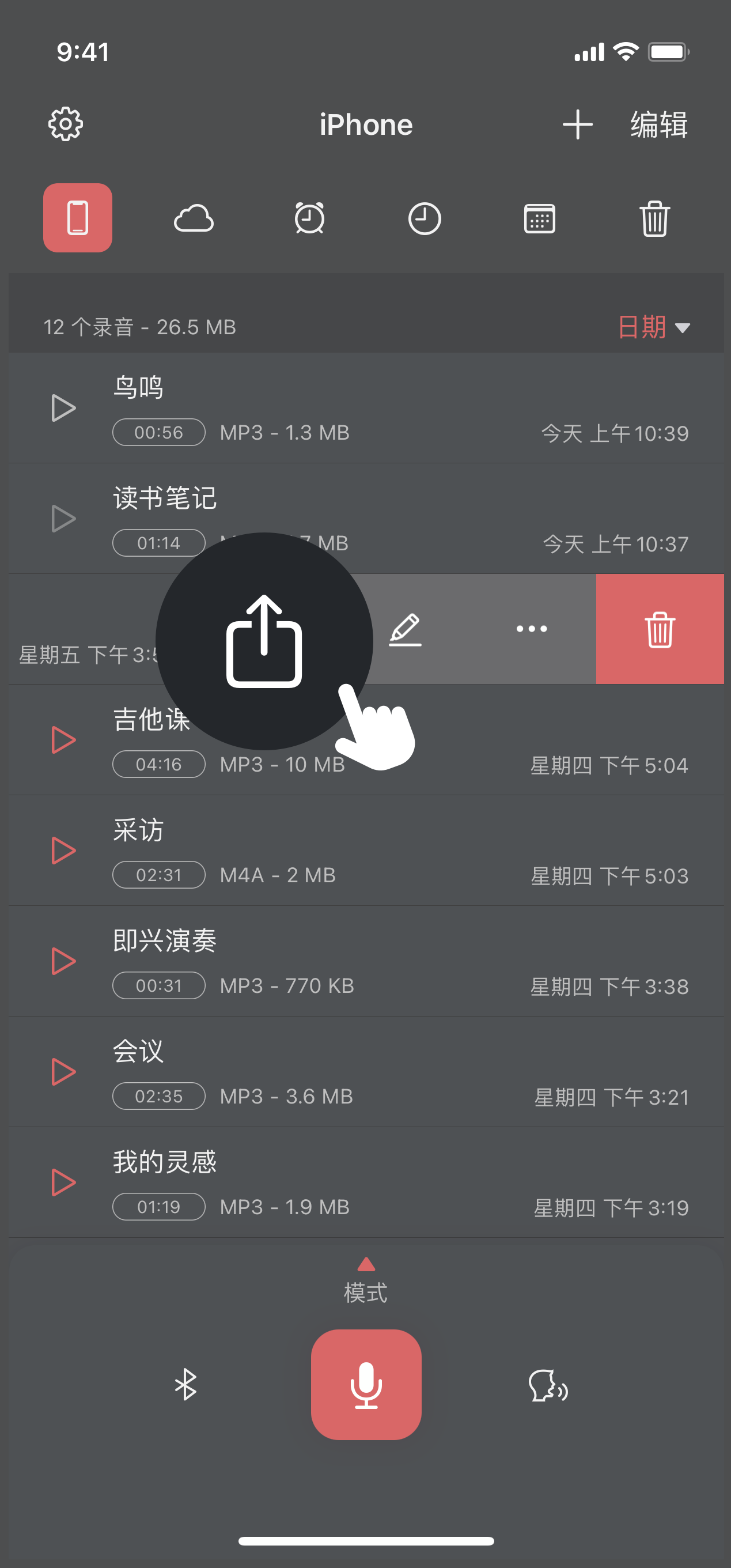 方法一:在录音文件上向左滑动- 点击 分享