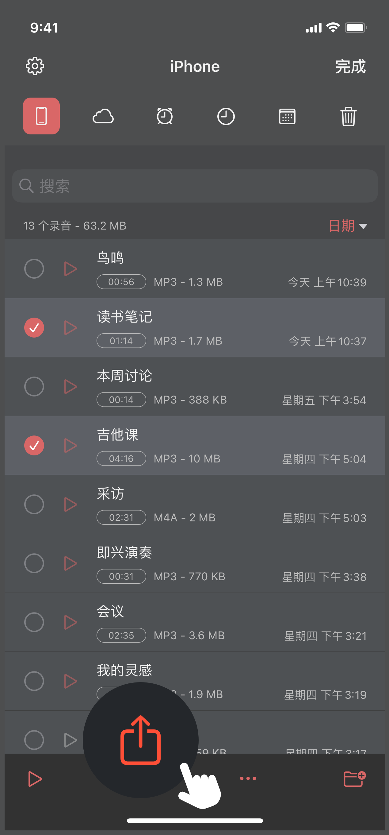 点击主界面右上方“编辑”,选择录音文件,点击“分享”